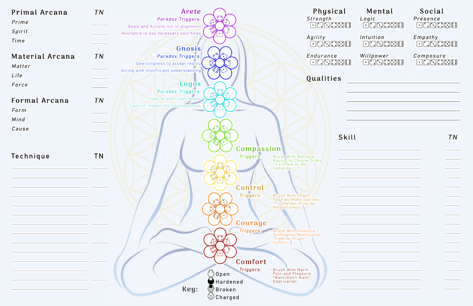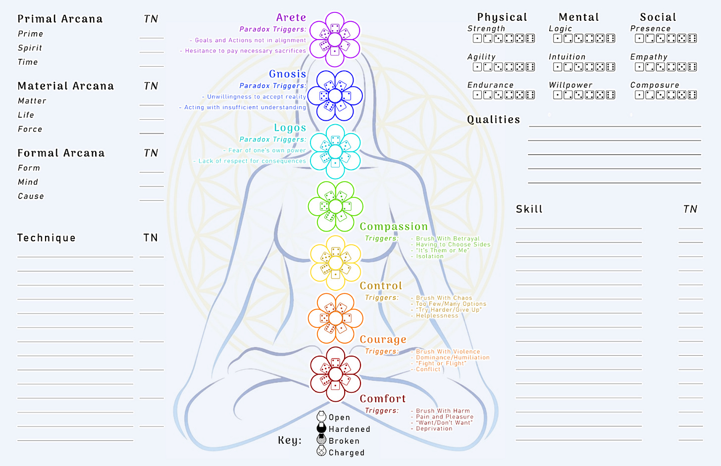 As mages grow, their paradigms tend to evolve – some towards greater flexibility, others towards narrower focus. A Mage’s open Logos ranks represent the flexibility of their paradigm, while their hardened Logos ranks represent the rigidity and focus of that paradigm. If two mages with different paradigms attempt to perform magic together cooperatively, each must Push their Logos to make a Prime Arcana roll, to attempt to “translate” their understanding of magic into the other’s paradigm; they must achieve more successes with this roll than their erstwhile companion’s hardened Logos ranks.